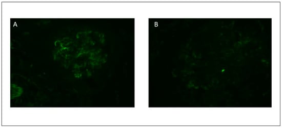 IgA-DIAGN is a morphological variant in which, unlike classical post-infectious GN, which involves C3 and IgG or only C3 deposition, IgA is the sole or dominant immunoglobulin mediator []. In most acute post-infectious (AP) GN cases, the agent involved is staphylococcus aureus; however, there are some cases associated with infection by other germs such as Streptococcus, Escherichia coli, Klebsiella pneumoniae, Chlamydia pneumoniae and Hepatitis A virus, among others [,,,,,]. IgA-DIAGN typically appears in the elderly, especially in patients with multiple comorbidities [,,,].
