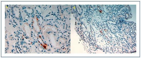 - Farkash, E.A.; Wilson, A.M.; Jentzen, J.M. Ultrastructural Evidence for Direct Renal Infection with SARS-CoV-2. J. Am. Soc. Nephrol. 2020, 31, 1683–1687. [Google Scholar] [CrossRef] [PubMed]