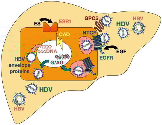 - Verrier, E.R.; Weiss, A.; Bach, C.; Heydmann, L.; Turon-Lagot, V.; Kopp, A.; El Saghire, H.; Crouchet, E.; Pessaux, P.; Garcia, T.; et al. Combined Small Molecule and Loss-of-Function Screen Uncovers Estrogen Receptor Alpha and CAD as Host Factors for HDV Infection and Antiviral Targets. Gut 2020, 69, 158–167. [Google Scholar] [CrossRef]