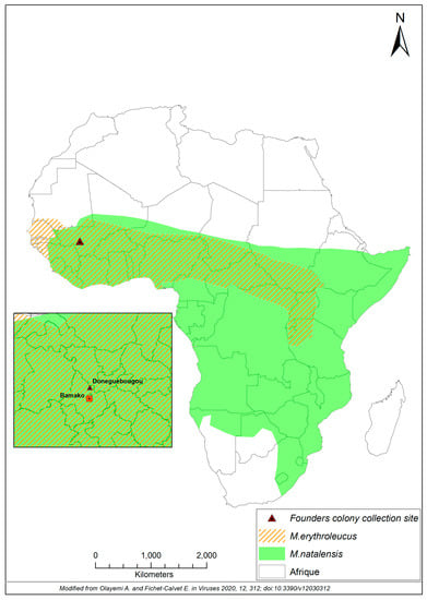 Geographic distribution of Mastomys natalensis and Mastomys erythroleucus in sub-Saharan Africa. Shown are the distributions of M. natalensis (shaded green) and M. erythroleucus (red-hatched) across sub-Saharan Africa. Inset denotes the village of Doneguebougou (triangle), where the founder rodents for the colony were live-trapped, in relation to the capital city of Bamako, Mali.