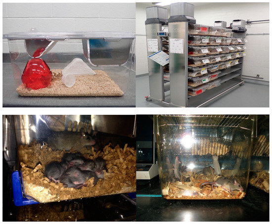 After importation, M. natalensis were maintained in breeding pairs in individually ventilated cages (Figure 3). Animals were kept in a dedicated room at a 12 h light cycle, 22 ± 2 °C, and 40–60% relative humidity in individually ventilated disposable cages (Innocage® IVC Rat Caging System, Innovive, San Diego, CA, USA), with autoclaved bedding (Sani-Chips®, P.J. Murphy Forest Product Corp., Montville, NJ, USA), and provided with ab libitum rodent chow (2018 Teklad global 18% protein rodent diet, Envigo Teklad, Denver, CO, USA) and reverse osmosis water. Enrichment included nesting material (Enviro-dri®, Shepherd Specialty Papers, Watertown, TN, USA) and shelters (Shepherd Shack®, Shepherd Specialty Papers, Watertown, TN and/or Crawl BallsTM, Bio-Serve®, Flemington, NJ, USA). For the first several months in captivity, animals were lightly sedated weekly with inhalational isoflurane while in their cages for health inspections and cage changing.
