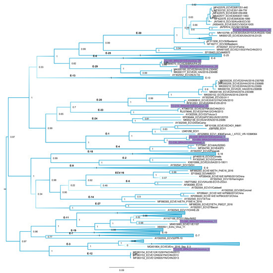 To assign genotypes to the strains detected in the present study, the publicly available Enterovirus Genotyping Tool (https://www.rivm.nl/mpf/typingtool/enterovirus, accessed on 5 February 2021) [31] was used in order to assign genotypes and to confirm previous BLASTx classification. We confirmed the previous classification into E1 (BRA/TO-028, BRA/TO-069 and BRA/TO-236), E3 (BRA/TO-018), E11 (BRA/TO-086), E20 (BRA/TO-016), E29 (BRA/TO-030, BRA/TO-193) and E30 (BRA/TO-032) obtained through a BLASTx search.