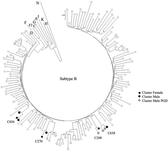 Overall, 105 sequences from study participants were combined with 8947 subtype B infections and 1746 non-B subtype infections genotyped in the province (2002–2019). Of these, a total of 13/105 participant sequences (12%; n = 7 males (54%)) formed part of eight phylogenetic clusters (Table 2). Among these, four clusters (cluster sizes = 2–3 people) included study participants alone (n = 9), whereas another four clusters (cluster sizes = 2–3 people) included four study participants clustered with six individuals from the provincial genotyping database. Among the former four clusters, three cluster pairs (CT270, CAG41, G5) were among known Haitian or Nigerian heterosexual couples, while cluster C636 represented a Haitian subtype-B cluster with two males and one female (none of whom were known partners). Among the four participant–provincial genotyping database clusters, these included one heterosexual Haitian female–provincial genotyping database male pair (CT268) and a female from Saint Vincent clustered with one provincial genotyping database male and one provincial genotyping database female (C569). In addition, there was two male–male clusters, one with a Haitian male clustered with two males from the provincial genotyping database (C638) and one pair consisting of an Algerian male clustered with a male from the provincial genotyping database (C645). Of the eight clusters, five clusters consisted of pairs (cluster size = 2). Among the eight clusters, resistance mutations were similar among cluster participants except for cluster G5.
