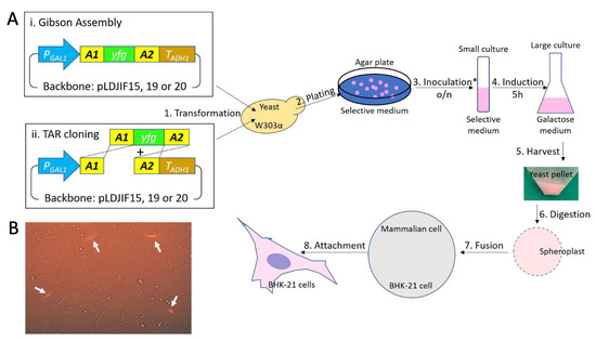 Yeast cytoplasmic elements are transferred to mammalian cells (BHK-21) via fusion. (A) An outline of yeast to mammalian cell fusion procedure (from sequence to fusion). * Colony PCR screening was used if transformation-associated recombination (TAR) cloning (ii) pathway was used. (B) Fluorescence micrographs of BHK-21 cells fused with yeast spheroplast prepared from induced yLDJIF9 (W303α transformed with pLDJIF15). yeCherry (pink) was expressed in yeast only. Pink BHK-21 cells (pointed out with an arrow) appear when the cytoplasmic element, including yeCherry, is transferred from yeast to BHK-21 cells via fusion.