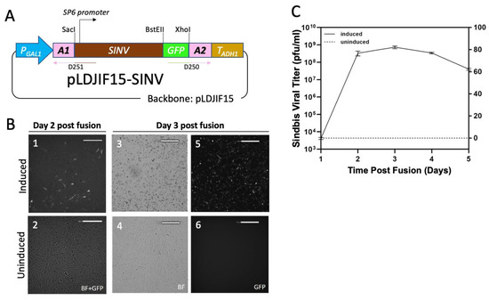 Our initial plan was to co-transform pLDJIF15-SINV with a galactose-inducible SP6 RNA polymerase expression plasmid using pLDJIF19 or 20 as a backbone into the same yeast cell. The rational was that by controlling the expression of SP6 RNA polymerase, we could control the Sindbis genomic RNA expression in yeast cells. Price et al. suggest that it is possible to induce flock house virus (FHV) genomic mRNA expression under Gal1 promoter in yeast without SP6 RNA polymerase [19]. Indeed, we found that pLDJIF15-SINV by itself responded to galactose-induced Sindbis genomic mRNA expression (Figure 3). We prepared frozen spheroplasts from yeast cells harboring pLDJIF15-SINV (yLDJIF21) grown in galactose (induced) or glucose (uninduced) containing medium. The frozen spheroplasts were thawed carefully and fused with BHK-21 cells. After fusion, we observed the GFP signal (on Day 2), followed by the cytopathic effect (CPE) (on Day 3) from BHK-21 cells fused with spheroplasts grown in galactose (induced; Figure 3B images 1, 3, 5) but not glucose (uninduced; Figure 3B images 2, 4, 6) medium (Figure 3B). We measured SINV viral titer from the supernatant (Figure 3C). After fusing the spheroplasts made from yeast (yLDJIF21) grown in galactose medium, we detected viral production on day 1 after fusion (4.2 × 103 pfu/mL) via plaque assay (Figure 3B,C). The titer increased to 3.3 × 108 pfu/mL on day 2 after fusion and peaked (7.3 × 108 pfu/mL) on day 3 after fusion when accompanied with CPE (Figure 3B,C). The peak SINV titer produced from our procedure was comparable to the titer generated from transfecting BHK-21 cells with in vitro transcribed SINV genome [35]. The successful rescue of SINV was also confirmed by the increase in the GFP signal (Figure 3B). Importantly, no viral titer was observed in BHK-21 cells fused with spheroplasts prepared from uninduced yLDJIF21. This indicated it was the mRNA expression driven by GAL1 promoter, rather than the pLDJIF15-SINV DNA, that rescued SINV.