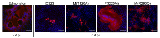 - Watanabe, S.; Ohno, S.; Shirogane, Y.; Suzuki, S.O.; Koga, R.; Yanagi, Y. Measles virus mutants possessing the fusion protein with enhanced fusion activity spread effectively in neuronal cells, but not in other cells, without causing strong cytopathology. J. Virol. 2015, 89, 2710–2717. [Google Scholar] [CrossRef]