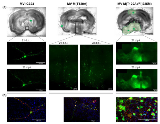 The following are available online at https://www.mdpi.com/article/10.3390/v13040605/s1, Table S1: Primers used to generate MV clones on the basis of pT(+)MV323-eGFP., Table S2: Primers used to sequence the generated MV genome encoding plasmids and viruses; Table S3: Mutations found in the isolates from rat brains.