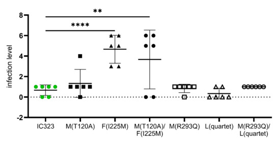 To elucidate their effect on the viral replication, the mutations were inserted into the full-length MV genome-encoding plasmid pT(+)MV323-eGFP. According to the isolate they were detected in, the substitutions were induced solely or in the found combination. The whole MV sequence was evaluated in the plasmid to identify unwanted mutations. Only correct plasmids were used to rescue the virus. Generated virus mutant strains were named by the mutations they harbored: MV-M(T120A), MV-F(I225M), MV-M/F(T120A)/(I225M), MV-M(R293Q) and MV-L(E628G/I1154V/I1493V/V1725I), from here on designated MV-L(quartet) and MV-M/L(R293Q)/(quartet). Prior to the experiments, the genome sequence at the sides of the point mutagenesis was determined and only the desired mutations were detected. Replication of the generated clones was compared to the parental virus MV-IC323. All virus clones induced syncytia formation in the Vero/hSLAM cells. To investigate the possible impacts of the induced point mutations on viral replication, infectious viral particles were quantified at various time points. As displayed in Figure 1, a significantly increased replication rate compared to the parental MV-IC323 was induced by the R293Q mutation in the matrix protein. The growth advantages were detected as early as two days post infection and were induced by the M(R293Q) mutation since the L(quartet) mutation solely had no advantageous effect compared to IC323. With the exception of the MV-L(quartet) mutant, which showed 24 h delayed growth, all viruses reached their maximum titers in the Vero/hSLAM cells three days after the infection.