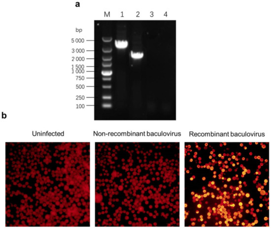 The recombinant baculoviruses were confirmed by PCR (Figure 1a). The indirect immunofluorescence assay showed that a specific bright orange–red image was captured in the Sf9 cells infected by recombinant baculoviruses, while there was no such image in the Sf9 cells infected by non-recombinant baculoviruses, nor in the uninfected cells (Figure 1b). (The results of identification of recombinant transfer vectors and bacmids are shown in Supplementary Figure S1.)