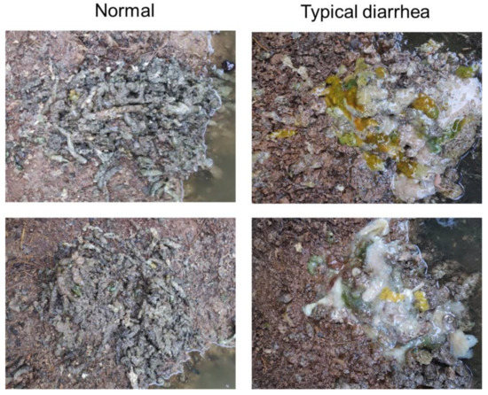 Appearances of normal feces and typical diarrhea. Two samples are displayed for each category. The feces of healthy minks were dark green and relatively dry (normal), while those of sick minks were yellow, grey, and waterish (typical diarrhea), which is the classical symptom of mink refractory diarrhea.