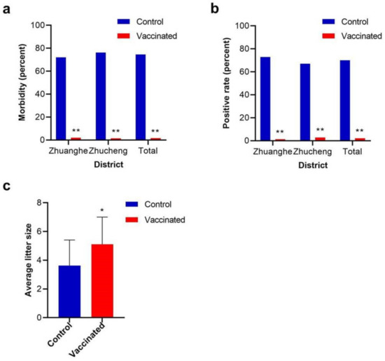 Comparison of morbidities, positive rates of fecal samples, and average litter sizes between control and vaccinated groups. (a) Comparison of morbidities between control and vaccinated groups in Zhuanghe, Zhucheng, and total. (b) Comparison of positive rates of fecal samples between control and vaccinated groups in Zhuanghe, Zhucheng, and total. (c) Comparison of average litter sizes between control and vaccinated groups in total (* p < 0.05; ** p < 0.01).