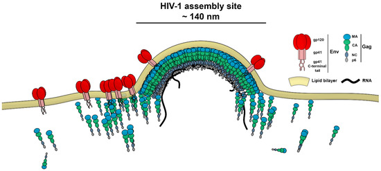 The HIV-1 assembly site is a sub-diffraction-sized (≈140 nm) area of Gag protein multimerisation which leads to the release of the virus particle from the plasma membrane of the infected cell. The Gag protein, a key player in this process, is a major structural protein in the virus and mediates interactions between the assembling virus particle and plasma membrane lipids (Figure 1). Its four domains (MA, CA, NC and p6) are responsible for targeting Gag towards the cell plasma membrane (MA), mediation of Gag–Gag multimerisation interactions (CA), RNA encapsidation (NC) and the recruitment of cell factors required for HIV-1 particle budding from the host cell plasma membrane (p6) [11]. Env is another key HIV‑1 protein responsible for virus attachment and fusion with the target cells. During HIV-1 assembly, only 7–10 copies of this trimeric glycoprotein become incorporated into the virus particle in the process regulated by interactions between the MA domain of Gag and the Env C-terminal tail [12,13,14].
