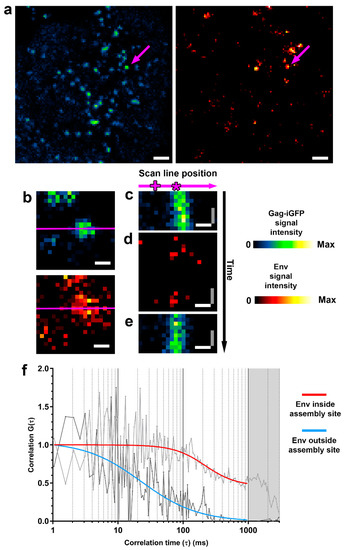 The acquisition of the fluorescently tagged Env inside and outside assembly sites was guided by the Gag.iGFP signal, which was used to align the STED-FCS scan line (Figure 2b). Newly appearing (post cell adherence) small and immobile Gag.iGPF clusters were selected for subsequent analysis. After the alignment with the Gag.iGPF cluster, the microscope was switched from imaging (xy axis) mode to scanning line (xt axis) mode. Temporal fluorescence intensity fluctuations were then recorded at each pixel position along the multiple scanned lines (denoted “intensity fluctuation carpet”), including areas with and without Gag.iGPF fluorescence, which correspond to areas inside and outside the virus assembly site. We first quickly acquired a fluorescence intensity fluctuation carpet for the Gag.iGFP signal in confocal mode (Figure 2c), in order to confirm that (1) the scanned line was correctly aligned with the virus assembly site, and (2) that the observed virus assembly site was sufficiently immobile to allow for observations unbiased by, for example, drifting of the Gag.iGFP signal. Subsequently, we acquired the intensity fluctuation carpet for the Env signal in STED mode (100 nm observation spot size) (Figure 2d), finally followed by the acquisition of another fluorescence intensity fluctuation carpet of Gag signal in confocal mode to ensure negligible drift of the observed virus assembly site (Figure 2e).
