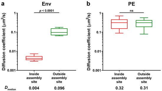 Two-colour sSTED-FCS allowed for a successful observation of Env mobility within (red boxes) and outside (green boxes) HIV-1 assembly sites on the surfaces of infected Jurkat T-cells (Figure 3a). Results indicated that the median diffusion coefficient of Env molecules within the assembly site is very highly reduced (Dmedian = 0.004 µm2/s, interquartile range (IQR) = 0.001 µm2/s) compared to the mobility outside the assembly site (Dmedian = 0.096 µm2/s, IQR = 0.089 µm2/s). We observed no such confinement for experiments of phosphatidylethanolamine (PE) lipid mobility inside the virus assembly site (Figure 3b), performed as a part of our related lipid mobility study [10]. The outside Env mobility was similar to the result obtained previously [22] for sSTED-FCS measurements of Env plasma membrane mobility in HeLa cells transfected with Env-expressing construct (Dmedian = 0.074 µm2/s, IQR = 0.054 µm2/s). The direct relationship between the diffusion coefficient and spot size diameter is consistent with trapped diffusion behaviour that was previously reported for cell surface Env [22]. We have to note that the previously observed lower values of the Env diffusion coefficient in transfected HeLa cells were a result of performing this experiment with a STED observation spot of a smaller size—55 nm instead of 100 nm in diameter, as in this study—which was only possible due to the high signal-to-noise ratio of the Env signal in the transfected cell model.