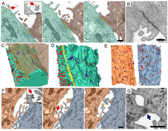 ROIs of cell-cell contacts with viral particles were either imaged by FIB-SEM in house (Vero E6 cells, Figure 2A–D, Supplementary movie M1) or downloaded from FIB-SEM data deposited on EMPIAR (Calu-3 cells, [15], Figure 2E–G). The ROIs were segmented aided by the watershed and threshold modules on 3DSlicer followed by manual clean up and rendering. These showed extensive contacts between adjacent cells (Figure 2A, brown and green) mediated by contiguous tight junctions (yellow, and Figure 2B) and some punctate focal connections (Figure 2C,D, purple). Interestingly, there is a dramatic surface viral density difference on either side of the tight junction (Figure 2C,D), suggesting that SARS-CoV-2 may “surf” [98] on plasma membranes of filopodia, and that this may be restricted by tight junctions. Experiments with more organized or 3-D epithelial layer cultures are warranted. Neighboring Calu-3 cells also had closely apposed plasma membranes (Figure 2E,F) with multiple desmosome-like contacts in the areas examined (Figure 2E,G); this appeared to have little impact in the spatial distribution of virus on either cell membrane (Figure 2E), presumably due to the lack of a contiguous barrier. The term “virological synapse”, akin to the immunological synapse, may be described as a cytoskeleton-dependent, stable adhesive junction across which virus is transmitted by directed transfer [99], and is understood to be relevant in the transmission of enveloped viruses between immune, epithelial, and other cell types [100,101,102]. It is tempting to term these cell-cell contacts as virological synapses; FIB-SEM imaging has been used to characterize these structures in cell-to-cell HIV transmission [63], and these have been documented by fluorescence microscopy in cell-to-cell transmission between coronavirus-infected cells [103], but we believe that in the absence of correlative evidence and a lack of clear polarization of organelles with concomitant concentration of virus in the contact region, this would be speculative. However, targeted CLEM experiments may clarify these intriguing observations in the future.