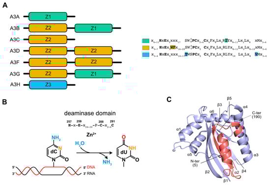 The seven members of the A3 family of proteins contain one (A3A, A3C, and A3H) or two (A3B, A3D, A3F, and A3G) copies of a catalytic deaminase (CD) domain that is distinguished by the presence of a signature motif, His-X-Glu-X23-28-Pro-Cys-X2-4-Cys (Figure 1A). When the enzyme contains two CDs, CD2 is catalytically active [] while CD1 is involved in nucleic acids binding [,,], its oligomerization and movements along the substrate to increase the deamination efficiency [,,]. CDs and adjacent domains are organized into three phylogenetically distinct groups, named zinc-coordinating domains, Z1, Z2, and Z3 [,]. The mechanism of catalysis involves the histidine and the two cysteine residues that coordinate a zinc ion that enables the glutamic acid to deprotonate a water molecule, and generates the zinc hydroxide ion that will react with the carbon C4 of the cytosine (Figure 1B). The CDs’ tridimensional structure is conserved between A3s and is composed of five β strands and six α helices organized around the deaminase domain (Figure 1C) (for more details regarding the structure of A3 proteins, please refer to these recent reviews [,,]).