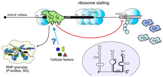 While mechanisms leading to A3G translation inhibition still remain unclear, we recently uncovered the importance of a short and conserved upstream ORF (uORF) located within SL2–SL3 of the 5’UTR of A3G and A3F mRNAs (Figure 5) []. Interestingly, the uORF represses A3G translation itself (40%), as do many uORF located in 5’UTR of mRNAs [,,], but it is also mandatory for the Vif-mediated repression of A3G translation and for the redirection of A3G mRNA into stress granules in the presence of Vif []. The fact that Vif was previously shown in vitro to interact with the lower and upper stems of SL3 [] suggests that Vif may block ribosome scanning (stalling). Given the proportion of genes that have one or more uORFs in their 5’UTR [,,], one cannot rule out the possibility that Vif might be able to regulate the translation or the trafficking of such mRNAs in the cell. Notably, A3G was shown by immunofluorescence studies to localize to P-bodies and stress granules [,,,,,]; on the contrary, Vif was observed in P-bodies only in the presence of A3G, suggesting that Vif could selectively remove A3G from and/or restrict its localization to P-bodies to induce its degradation [].