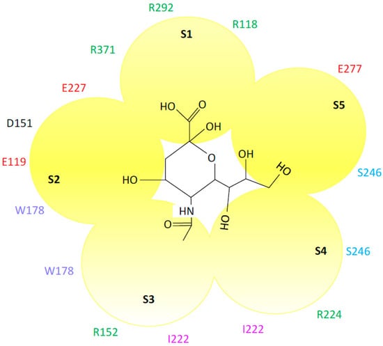 Interaction of the neuraminidase active site with sialic acid. The interacting amino acids and the active site subsites (S1–S5) are shown (N2 numbering). Glutamic acid (red), serine (blue), arginine (green), tryptophan (violet) and aspartic acid (black). Sialic acid is shown in the center of the figure. Adapted from References [8,9]. Sialic acid structure was adapted from PubChem.