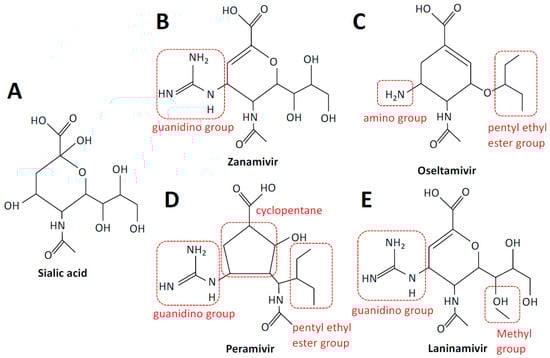 Structures of sialic acid and neuraminidase inhibitors. Sialic acid (A), zanamivir (B), oseltamivir (C), peramivir (D), and laninamivir (E). Structural elements are highlighted in red. Structures were adapted from PubChem.