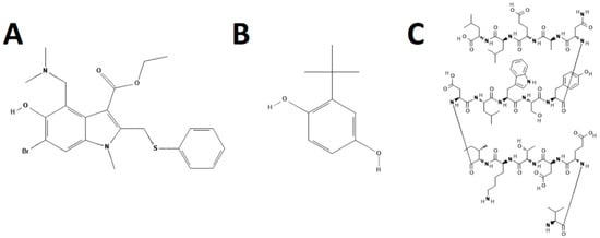 Structures of hemagglutinin fusion inhibitors. Umifenovir (Arbidol) (A), Tert-butyl hydroquinone (TBHQ) (B), and Flufirvitide-3 (C). Structures were adapted from PubChem.
