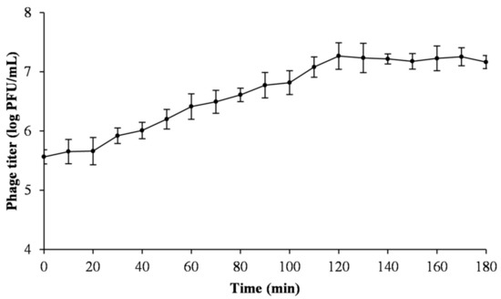 A one-step growth curve experiment was conducted as described in Di Lallo et al. with slight modifications [14]. Phage (0.1 mL: approximately 107 PFU/mL) was added at a multiplicity of infection (MOI) of 0.01 to Psa (SCJY02-1) cells (1.0 mL: approximately 108 CFU/mL) and allowed to adsorb on the cells for 10 min at 27 °C. Thereafter, the mixture was centrifugated at 10,000× g for 2 min to remove any non-adsorbed phage. The supernatant was discarded, and the pellet was resuspended in 10.0 mL NB. The mixture was cultured at 27 °C with shaking. Samples were obtained at 10 min intervals and the phage titer was determined by the double-layer agar plate method. Data from the experiment were analyzed, and the burst size was calculated as the ratio of the final count of liberated phage particles to the initial count of infected bacterial cells during the latent period. The initial titration of adsorbed phage equals the number of infected bacterial cells.