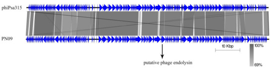 BLASTn comparison of the complete genome sequence of the phage PN09 with the closet homolog phage phiPsa315 using Easyfig. The blue arrows indicate the predicted genes of both phages. The homologous regions between the phages are indicated by gray shading.