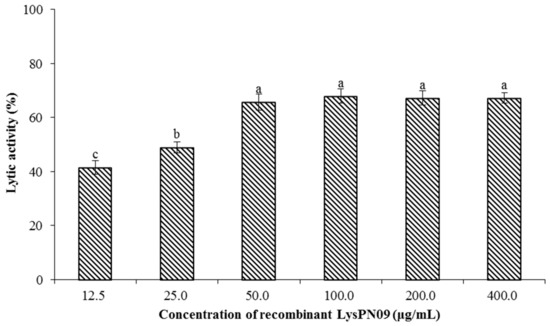 The lytic activity of recombinant LysPN09 on the Psa strain SCJY02-1 was determined by turbidimetry. A reduction of approximately 65% in the turbidity of Psa strain SCJY02-1 was recorded at LysPN09 concentrations from 50.0 to 400.0 μg/mL (Figure 6), with no significant difference in lytic activity among these concentrations (p > 0.05). However, the lytic activity was significantly lower (p < 0.05) when the concentration of LysPN09 was lower than 50.0 μg/mL.