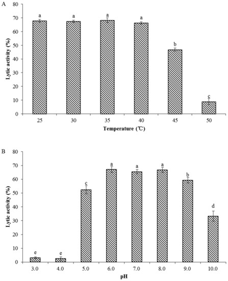 To determine the characterization of recombinant endolysin LysPN09, the antibacterial activity of LysPN09 was tested at various temperatures and pH values. As shown in Figure 7, the lytic activity of LysPN09 was stable at temperatures from 25 to 40 °C and at pH values from 6.0 to 8.0. However, the lytic activity of LysPN09 was still above 40% at 45 °C. When the temperature increased to 50 °C, the lytic activity decreased to less than 10%, which was significantly lower than at 45 °C. (p < 0.05). Regarding the pH effect, LysPN09 had almost no lytic activity at pH 3.0 and 4.0, whereas at pH 9.0, the lytic activity of LysPN09 was close to 60%.