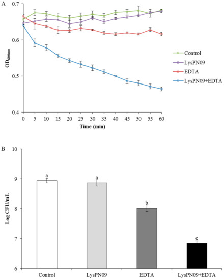 As shown in Figure 8B, there was approximately a 2-log reduction in Psa cells after a 1 h treatment with LysPN09 + EDTA in comparison to the control group, whereas less than a 1-log reduction of Psa cells were killed after a 1 h treatment with EDTA alone. In the treatment with LysPN09 only, no significant reduction of Psa cells in comparison to the control group was observed (p = 0.3588). The residual cell CFU number of Psa in LysPN09 + EDTA treatment was significantly lower than that in both the treatments with only EDTA or LysPN09 (p < 0.05).