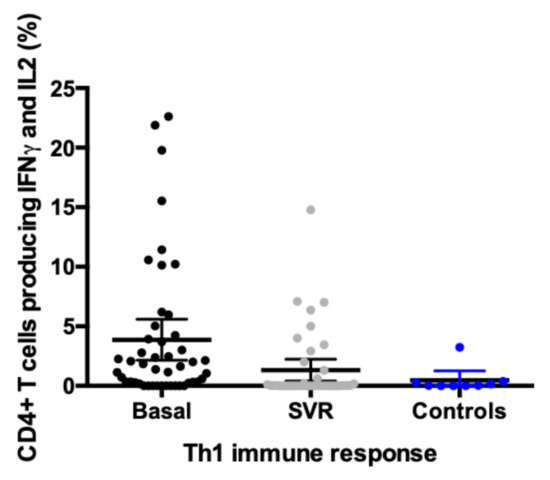 Distinctive Th1 immune response before and after treatment and compared to healthy controls. Intracellular cytokine staining in CD4+ T cells. Data represented as percentage of double positive IFN + IL2 expressed as mean (95% CI): basal expression 3.87 (2.15–5.59); SVR week +48 expression 1.32 (0.41–2.23); healthy controls expression 0.46 (0.00–1.27).