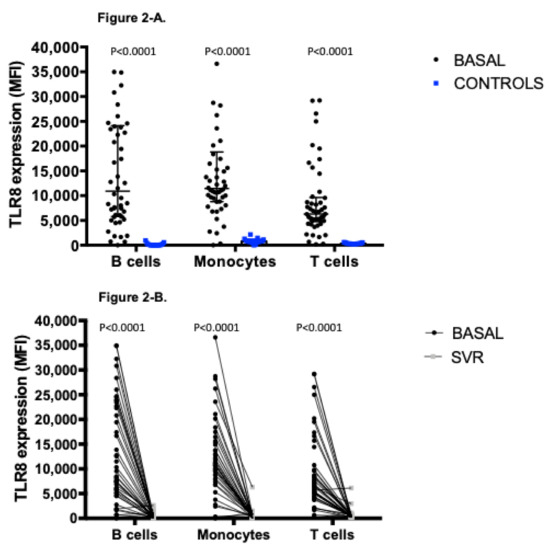 The expression of TLR in PBMC from HCV patients has been previously studied [13,14,15]. Most of them found increased activity of TLR2 and TLR4, including higher cytokine production following ex vivo TLR activation [13] with almost no involvement of other TLRs. Very few works have studied the expression of TLR8 in HCV infected patients and found equivalent results to ours [16,17]. We followed a different approach by measuring the protein expression by flow cytometry in the main three PBMC subsets (T, B, and monocytes), whereas the previous studies used qPCR. Such an overexpression of TLR8 associated with higher cytokine response could be explained by the incapacity of the innate and, secondary, the adaptative immune system, to clear the viral infection, as suggested by other authors [18]. Chen Yi Mei et al. found a decreased expression of TLR4 on monocytes and NK cells and a lower function of TLR4 and TLR7/8 in acute HCV infected subjects and after spontaneous clearance. In our study, the hyperexpression and function of TLR8 was associated with chronic infection but returned to healthy control levels after SVR.