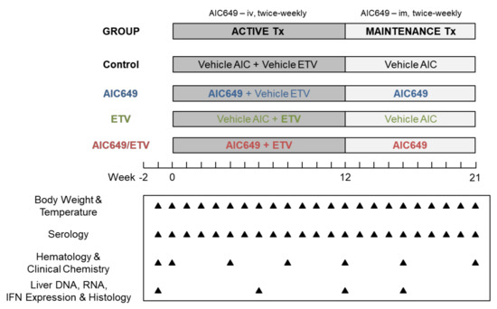 Study design. For active treatment, AIC649 was administered twice-weekly by iv injection during the initial 12 weeks of the study to woodchucks of the AIC649 and AIC649/Entecavir (ETV) Groups. ETV was provided by daily po administration during the initial 12 weeks of the study to woodchucks of the ETV and AIC649/ETV Groups. Following the switch to maintenance treatment, AIC649 was administered twice-weekly by im injection during the next 9 weeks to woodchucks of the AIC649 and AIC649/ETV Groups. Antiviral efficacy and safety of the mono and combination treatment regimens were compared to double placebo treatment of woodchucks of the Control Group, as well as between the AIC649, ETV, and AIC649/ETV Groups. Arrows indicate the time of measurements for the specific parameters listed. Abbreviation: iv, intravenous, im, intramuscular, Tx, treatment, IFN, interferon.
