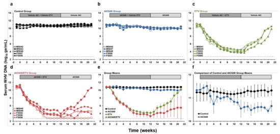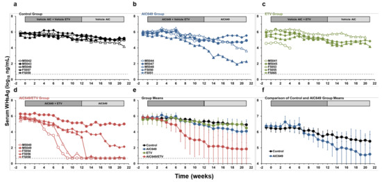 AIC649/ETV combination treatment results in suppression or undetectability of serum surface antigenemia in most woodchucks. Changes in serum WHsAg levels relative to pretreatment (week −1 and T0) in woodchucks during (a) placebo treatment, (b) AIC649 monotreatment, (c) ETV monotreatment, (d) AIC649/ETV combination treatment, and (e) geometric group means. (f) The comparison of geometric means of Control and AIC649 Groups illustrates the biphasic change in serum WHsAg level during initial AIC649 monotreatment. The horizontal dotted line indicates the detection limit for WHsAg (i.e., 5.0 ng/mL). The vertical lines represent the standard error of the mean. Antigenemia levels were significantly reduced compared to the Control Group during weeks 7–21 in the AIC649/ETV Group (p < 0.05) but not in the AIC649 and ETV Groups (p > 0.05). Antigenemia levels were also significantly reduced compared to the AIC649 Group at weeks 3, 6, 8, and 9 in the AIC649/ETV Group (p < 0.05) but not in the ETV Group (p > 0.05). The antigenemia level was further significantly reduced compared to the ETV Group at weeks 13 and 14 and during weeks 17–20 in the AIC649/ETV Group (p < 0.05).