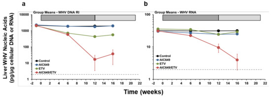 AIC649/ETV combination treatment results in suppression of WHV nucleic acids in the liver. Comparison of geometric means of the Control, AIC649, ETV, and AIC649/ETV Groups relative to pretreatment (week −1) for intrahepatic levels of (a) WHV DNA replicative intermediate (RI) and (b) WHV RNA. The horizontal dotted line indicates the detection limit for WHV nucleic acids (i.e., 2.0 pg/µg cellular DNA or RNA). The vertical lines represent the standard error of the mean. WHV DNA RI levels were significantly reduced compared to the Control Group at weeks 6, 12, and 16 in both the ETV Group (p < 0.01) and the AIC649/ETV Group (p < 0.05) but not in the AIC649 Group (p > 0.05). WHV DNA RI levels were also significantly reduced compared to the AIC649 Group at weeks 6, 12, and 16 in both the ETV Group (p < 0.005) and the AIC649/ETV Group (p < 0.05). The WHV DNA RI level was comparable between the ETV and AIC649/ETV Groups (p > 0.05). WHV RNA levels were significantly reduced compared to the Control Group at week 16 in the AIC649/ETV Group (p < 0.05) but not in the AIC649 and ETV Groups (p > 0.05). WHV RNA levels were also significantly reduced compared to the AIC649 Group at week 16 in the AIC649/ETV Group (p < 0.005) but not in the ETV Group (p > 0.05). The WHV RNA level was further significantly reduced compared to the ETV Group at week 16 in the AIC649/ETV Group (p < 0.05).
