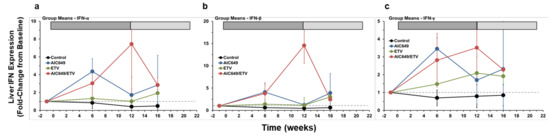 AIC649/ETV combination treatment results in enhanced expression of type I and II interferons (IFNs) in the liver. Comparison of means of the Control, AIC649, ETV, and AIC649/ETV Groups relative to pretreatment (week −1) for intrahepatic transcript levels of (a) IFN-α, (b) IFN-β, and (c) IFN-γ. Fold-change values were calculated relative to the pretreatment baseline, which was set a 1.0 and is indicated by the horizontal dotted line. The vertical lines represent the standard error of the mean. IFN-α transcript levels were significantly increased compared to the Control Group at week 6, at week 16, and at weeks 6, 12, and 16 in the AIC649 Group (p < 0.01), ETV Group (p < 0.05), or AIC649/ETV Group (p < 0.05), respectively (p < 0.05). IFN-α transcript levels were comparable between the AIC649, ETV, and AIC649/ETV Groups (p > 0.05). Compared to the Control Group, the IFN-β transcript levels were significantly increased at week 6 and at weeks 6, 12, and 16 in the AIC649 Group (p < 0.05) or AIC649/ETV Group (p < 0.05), respectively, but not in the ETV Group (p > 0.05). IFN-β transcript levels were also significantly increased compared to the AIC649 Group at week 12 in the AIC649/ETV Group (p < 0.005) but not in the ETV Group (p > 0.05). The IFN-β transcript level was further significantly increased compared to the ETV Group at week 12 in the AIC649/ETV Group (p < 0.05). IFN-γ transcript levels were significantly increased compared to the Control Group at week 6 and at weeks 6, 12, and 16 in the AIC649 Group (p < 0.001) or AIC649/ETV Group (p < 0.05), respectively, but not in the ETV Group (p > 0.05). IFN-γ transcript levels were comparable between the AIC649, ETV, and AIC649/ETV Groups (p > 0.05).