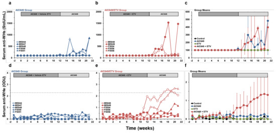 AIC649 monotreatment and AIC649/ETV combination treatment elicits WHV-specific antibodies in a subset of woodchucks. Changes in serum anti-WHs antibody titers and anti-WHe antibody levels relative to pretreatment (week −1 and T0) in woodchucks during (a,d) AIC649 monotreatment, (b,e) AIC649/ETV combination treatment and (c,f) means of experimental groups. The horizontal dotted line indicates the detection limit for anti-WHs antibodies (i.e., 100 StdU/mL) in the top panels and for anti-WHe antibodies (i.e., 2.286 ODU) in the bottom panels. The vertical lines represent the standard error of the mean. Anti-WHs titers were comparable between the Control, AIC649, ETV, and AIC649/ETV Groups (p > 0.05). Anti-WHe antibody levels were significantly increased compared to the Control Group during weeks 17–21 in the AIC649/ETV Group (p < 0.001), but not in the AIC649 and ETV Groups (p > 0.05). Anti-WHe antibody levels were comparable between the AIC649, ETV, and AIC649/ETV Groups (p > 0.05). Abbreviations: ODU, optical density unit; StdU, standard unit.