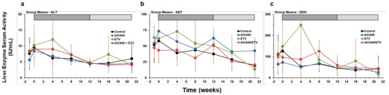 AIC649 monotreatment and AIC649/ETV combination treatment results in minor but transient elevations in the serum activity of liver enzymes. Comparison of means of the Control, AIC649, ETV, and AIC649/ETV Groups relative to pretreatment (week −1 and T0) for serum levels of (a) alanine aminotransferase (ALT), (b) aspartate aminotransferase (AST), and (c) sorbitol dehydrogenase (SDH). The vertical lines represent the standard error of the mean. ALT levels were comparable between the Control, AIC649, ETV, and AIC649/ETV Groups (p > 0.05). AST levels were significantly increased compared to the Control Group at week 12 in the AIC649 Group (p < 0.001) but not in the ETV and AIC649/ETV Groups (p > 0.05). The AST level was significantly reduced compared to the AIC649 Group at T0 in the AIC649/ETV Group (p < 0.05). AST levels were comparable between the ETV and AIC649/ETV Groups (p > 0.05). SDH levels were comparable between the Control, AIC649, ETV, and AIC649/ETV Groups (p > 0.05). Abbreviation: IU, international units.