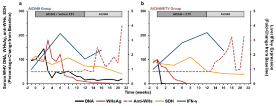 AIC649 monotreatment and AIC649/ETV combination treatment induce tightly regulated immunological and virological responses during active and maintenance treatment. Comparison of group means relative to pretreatment (week −1 or T0) during (a) AIC649 monotreatment and (b) AIC649/ETV combination treatment for serum WHV DNA, WHsAg, anti-WHs antibodies, and SDH and intrahepatic IFN-γ expression. The group mean for parameters on the left y-axis is presented as a percentage-change, while the group mean for parameters on the right y-axis is presented as a fold-change.