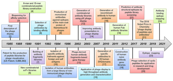 - Bratkovic, T. Progress in phage display: Evolution of the technique and its applications. Cell. Mol. Life Sci 2010, 67, 749–767. [Google Scholar] [CrossRef]