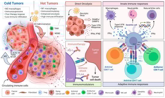 The extensive heterogeneity of the TME and the resultant immunosuppression has been a major hurdle to the development of effective cancer treatments. Immune cells within the TME belong to both innate (e.g., myeloid cells, macrophages, dendritic cells, neutrophils, NK cells) and adaptive (e.g., T cells, B cells) arms of the immune system, and their infiltration into the tumor is highly dependent on the soluble factors present in the TME []. Based on the presence of these immune cells within the TME, tumors with little to no presence of immune cells are referred to as “cold” tumors, whereas “hot” tumors have an active presence of immune cells and are more likely to respond to immunotherapeutic approaches including adjuvant therapies and immune checkpoint blockade (ICB) [] (Figure 1). Accordingly, therapeutic approaches that target both the cancer cells and the detrimental components of the TME have become expansive areas of research that have shown significant anticancer therapeutic potential. One such approach involves the use of oncolytic viruses (OVs) to simultaneously kill cancer cells and overturn tumor-associated immunosuppression [,,].
