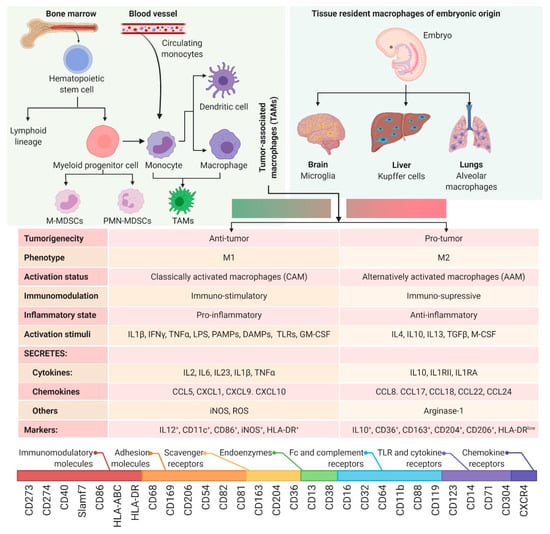 Ontogeny of macrophages. Top panel (left): Sources of macrophage recruitment, namely bone marrow and circulating monocytes; top panel (right): Various types of tissue resident macrophages; middle table: Characteristics of macrophage dichotomy; bottom: The spectrum of surface markers used to phenotype macrophages. Abbreviations: CAM: Classically activated macrophages; AAM: Alternatively activated macrophages; M-MDSC: Monocytic myeloid-derived suppressor cell; PMN-MDSC: Polymorphonuclear/granulocytic myeloid-derived suppressor cell; IL: Interleukin; IFN: Interferon; LPS: Lipopolysaccharide; PAMPs: Pathogen-activated molecular patterns; DAMPs: Damage-associated molecular patterns; TLR: Toll-like receptor; TNF: Tumor necrosis factor; CSF: Colony-stimulating factor; GM-CSF: Granulocyte-macrophage colony-stimulating factor; TGF: Transforming growth factor; iNOS: Nitric oxide synthase (inducible); ROS: Reactive oxygen species; CCL: Chemokine ligand; CXCL: C-X-C motif chemokine ligand; CD: Cluster of differentiation; HLA: Human leukocyte antigen; Slamf7: Signaling lymphocytic activation molecule F7.