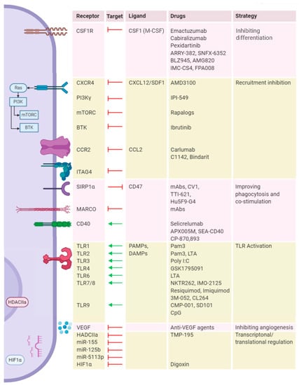 Current landscape of macrophage repolarization strategies. Various receptors, secretory molecules and regulatory pathways that skew macrophages to M2 state are lined on the left, and the respective therapeutic targets, their ligands, targeting strategies, and therapeutic agents are listed in the corresponding table on the right. Abbreviations: CSF1R: Colony-stimulating factor 1 receptor; CSF1: Colony-stimulating factor 1; M-CSF: Macrophage colony-stimulating factor; CXCR4: C-X-C chemokine receptor type 4; CXCL12: C-X-C motif chemokine ligand 12; SDF1: stromal cell-derived factor 1 (SDF1); PI3K: Phosphoinositide 3-kinase; mTORC: Mammalian target of rapamycin complex; BTK: Bruton’s tyrosine kinase; CCR2: C-C chemokine receptor type 2; CCL2: C-C Motif chemokine ligand 2; ITAG: Integrin alpha gamma; SIRP1α: signal regulatory protein alpha; MARCO: Macrophage receptor with collagenous structure; TLR: Toll-like receptor; CD: Cluster of differentiation; PAMPs: Pathogen-activated molecular patterns; DAMPs: Damage-associated molecular patterns; VEGF: Vascular endothelial growth factor; HDACIIa: Histone deacetylase class IIa; HIF1α: Hypoxia-inducible factor 1-alpha.