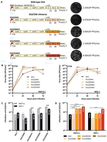 To compare the titers of the parental EILV and the recombinant viruses at each time point of the growth curves, an ordinary 2-way ANOVA using Dunnett’s multiple comparisons test or Šidák’s multiple comparisons test was performed. To compare the optimal titers obtained by each virus with two different MOIs, an ordinary 2-way ANOVA using Šidák’s multiple comparisons test was performed. To compare the optimal titers reached by the parental EILV and the recombinant viruses with the same MOI, an ordinary 2-way ANOVA using Dunnett’s multiple comparisons test or Šidák’s multiple comparisons test was performed. To compare the optimal titers obtained by EILV, EILV/CHIKV, and two chimeric double SG vectors, an ordinary one-way ANOVA using Tukey’s multiple comparisons test was performed. All statistical calculations were performed in Prism 9 (GraphPad Software, San Diego, CA, USA).