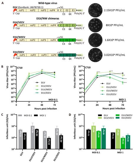By replacing the structural genes of EILV with those of different OW and NW alphaviruses, we generated a series of chimeric recombinants. The OW and NW viruses have evolved independently for the last few thousand years and exhibit significant divergence in the genomes. Our data proved that the EILV genome was compatible with these genetically distant lineages of alphaviruses (Figure 1A and Figure 2A). However, the constructed chimeras and the parental EILV displayed some variations. In the term of plaque phenotype, most chimeras somewhat exhibited heterogeneity in plaque morphology, suggesting potential for additional adaptations for efficient replication []. The plaques produced by EILV/SINV were most similar to those of EILV. EILV/VEEV generated significantly larger plaques than EILV, indicating increased infectiousness, while EILV/WEEV formed smaller plaques than EILV and other chimeras.