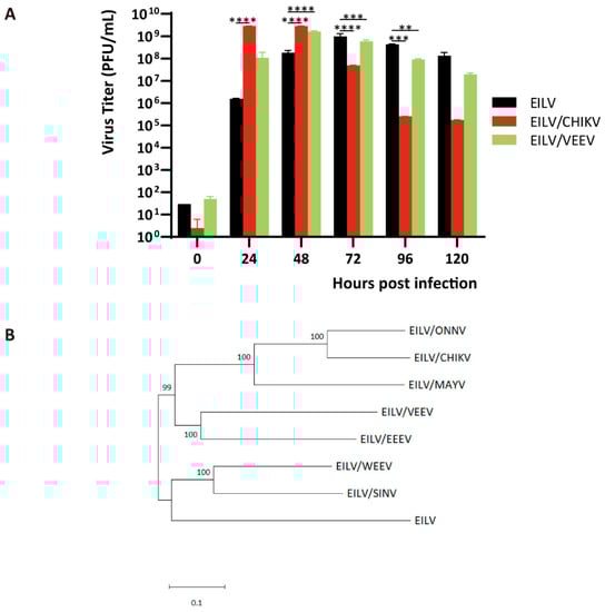 Notably, unlike the chimeras, the titer of EILV rose continuously by 72 hpi. The descending titers of constructed chimeras by 72 hpi indicated the impaired stability compared with the parental virus. For further evaluation, C7/10 cells were inoculated with EILV/CHIKV, EILV/VEEV, and EILV, respectively, at an MOI of 0.01. Samples were collected every 24 h for 120 h and titrated on C7/10 cells (Figure 3A). The titer of EILV/CHIKV rapidly peaked at 24 and 48 hpi and declined 58-fold by 72 hpi and four orders-of-magnitude by 96 hpi. The release of EILV/VEEV was slower, reaching the highest titer at 48 hpi. The titer then dropped gradually, descending 81-fold by 120 hpi. By contrast, the titer of parental EILV was maximum at 72 hpi, followed by a slight decline, with a drop of 6-fold at 120 hpi. Therefore, in this persistent replication study, EILV/VEEV maintained a more stable status than EILV/CHIKV, although both EILV/VEEV and EILV/CHIKV displayed inferior stability to the parental EILV. This difference in stability results from the intrinsic discrepancy between EILV/CHIKV and EILV/VEEV. According to the phylogenetic tree generated using the structural sequences of constructed chimeras (Figure 3B), EILV has proximity to EILV/WEEV and EILV/SINV. Given the evolutionary track that WEEV is a recombinant virus with glycoproteins from a SIN-like virus and the rest of the sequence from an EEE-like virus [,], EILV/WEEV has a resemblance to EILV/SINV and EILV/EEEV. Moreover, EILV/EEEV and EILV/VEEV are shown to be close relatives in the phylogenetic tree (Figure 3B). Therefore, it can be inferred that EILV is most likely to incline to the chimeras whose structural genes are from NW alphaviruses.
