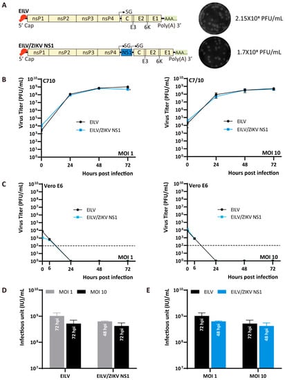 Genome organization and replication kinetics of EILV-based double subgenomic (SG) variant expressing Zika virus (ZIKV) nonstructural 1 (NS1) protein. (A) Genome organization of EILV/ NS1 recombinant. Virus was rescued on C7/10 cells and harvested at 3 dpe. Rescue titers and plaque phenotypes are displayed. (B) Replication kinetics in C7/10 and Vero E6 cells. C7/10 or Vero E6 cells were infected at an MOI of 1 or 10. Media were collected at the indicated time points post-infection, and titers were determined by plaque assay. (C) The optimal titers obtained by each virus with different MOIs. (D) Comparison of the optimal titers produced by EILV and EILV/NS1. The annotation embedded in each bar in (D) and (E) indicates the time point of reaching the highest titer. Each sample was titrated twice (n = 2). Average titers ±SD (error bars) are shown. *, p < 0.05.