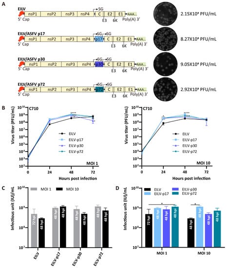 ASFV is the causative pathogen of the devastating African swine fever (ASF) that can kill almost all the infected pigs, posing a threat to global pork production and food security []. Currently, there are no vaccines available to prevent ASF. Therefore, it is of high priority to develop potential diagnostic tools and vaccines to control and halt this disease. By applying the antigens of this far-distant veterinary swine viral pathogen in a size-dependent manner, we validated the capability of EILV to incorporate foreign materials regardless of pathogen types and gene length. Three ASFV antigens were introduced individually, including major capsid protein p72, inner membrane protein p17, and early structural protein p30 [], the gene lengths of which are 1941, 354, and 606 bp, respectively. All the constructed double SG variants were readily rescued (Figure 5A). Specifically, EILV/p17 and EILV/p30 yielded higher titers than the original EILV, reaching 8.27 × 108 and 9.05 × 108 PFU/mL, respectively. The titer produced by EILV/p72 was comparable to that of EILV (2.92 × 108 PFU/mL). However, despite the original titer difference, three double SG vectors displayed similar growth curves on C7/10 cells with an MOI of either 1 or 10 (Figure 5B). These vectors displayed titers 2–4-fold higher than the parental EILV at 24 hpi and reached the highest titers at 48 hpi, ranging from 4.92 × 108 to 1.15 × 109 PFU/mL and significantly exceeding the titers of EILV. The titers then slightly declined by 72 hpi. Two MOIs had no significant effect on the optimal titers obtained by the three double SG variants (Figure 5C). Notably, either at MOI 1 or 10, the highest titers of the double SG recombinants were close to or even higher than that of EILV (Figure 5D). Conclusively, these double SG constructs, especially the EILV/p72 construct incorporating a large insert of about 2 kb, displayed the EILV-based expression platform’s superior tolerability.