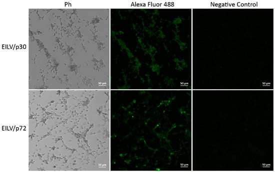 The antigenicity of the expressed heterogeneous proteins was subsequently determined by IFA. C7/10 cells were infected with EILV/p72 or EILV/p30 variant with an MOI of 5 and fixed and stained at 24 hpi. The fluorescence was readily observed in infected cells (Figure 6), indicating that the target antigens, ASFV p72 and p30, were produced and recognized by antigen-specific monoclonal antibodies. The expression of ASFV p17 has not been verified due to the lack of commercially available antibodies. These produced antigens can be applied to the serological diagnosis of ASV [].