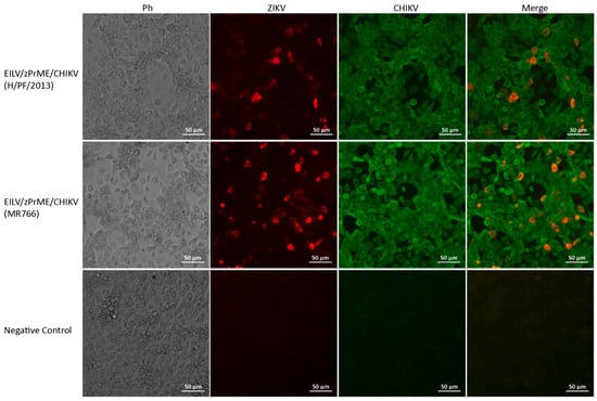 The antigenicity of the expressed ZIKV and CHIKV antigens was also determined by IFA on C7/10 cells. The cells were inoculated with EILV/zPrME/CHIKV H/PF/2013 or MR766 recombinant with an MOI of 5 and fixed and stained at 24 hpi. The E protein of ZIKV was labeled with red fluorescence, and the CHIKV antigens were labeled with green fluorescence. Both types of fluorescence were observed in infected cells and displayed overlay in the merged images (Figure 8), indicating that the cells expressed ZIKV and CHIKV antigens simultaneously. There are two scenarios for the generated antigens. The ZIKV envelope (E) proteins may integrate into the EILV/CHIKV chimeric viruses. The resulting viral particles can initiate single-round infection in vivo and activate the immune system. Alternatively, the produced ZIKV E and M proteins may form subviral particles, and therefore, the bivalent vaccines can consist of EILV/CHIKV chimeras and ZIKV virus-like particles. A thorough validation is required in the future.