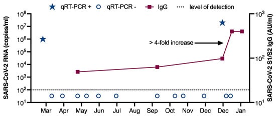 A 27-year-old female nurse working in a COVID-19 ward of the University Medical Center Hamburg-Eppendorf (UKE), Germany, developed fever, chills, and exertional dyspnea on 18 March 2020. She had no history of any underlying medical conditions and no indication of a compromised immunity. The patient immediately placed herself into self-quarantine and was tested positive for SARS-CoV-2 on March 20 by qRT-PCR of a naso- and oropharyngeal swab with 1 × 106 copies/mL (Figure 1) []. While the fever and chills resolved during domestic isolation on March 25, she reported exertional dyspnea for another four weeks. Notably, mild arterial hypertension was first diagnosed a few weeks after the infection, and treatment with bisoprolol was initiated. She returned to work at her ward after 17 days of quarantine, after testing negative for SARS-CoV-2 by qRT-PCR in two subsequent samples. Anti-SARS-CoV-2 spike (S1/S2) IgG levels in July 2020 were 40 AU/mL in July 2020 and thus clearly above the 15 AU/mL detection limit suggested by the manufacturer. At later time points, anti-spike (S1/S2) IgG levels remained stable (60 AU/mL in September 2020) (Figure 1 and Supplementary Materials Table S1). During the night shift of 26 to 27 December 2020, she developed a dry cough and mild rhinorrhea. Routine hospital surveillance by qRT-PCR (twice weekly using gargling solution) returned a positive result for SARS-CoV-2 on 27 December (<5000 copies/mL), 282 days after the first positive test. Consecutive qRT-PCR tests from naso- and oropharyngeal swabs on 28 and 29 December showed viral loads of 9 × 105 and 2 × 107 copies/mL, respectively.
